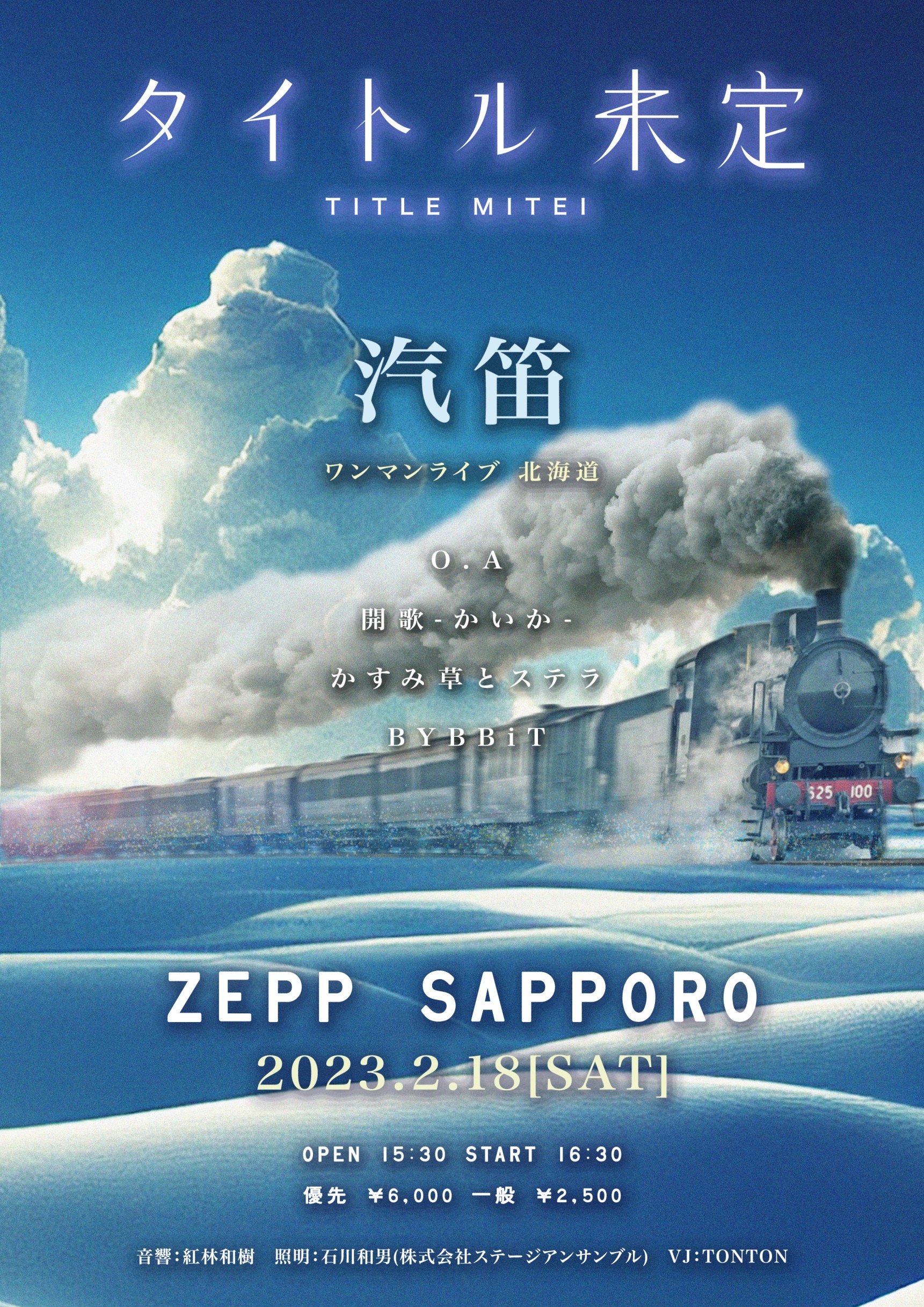 2月18日(土)に開催します、タイトル未定 ワンマンライブ 北海道 「汽笛」Zepp Sapporoについてのお知らせです。